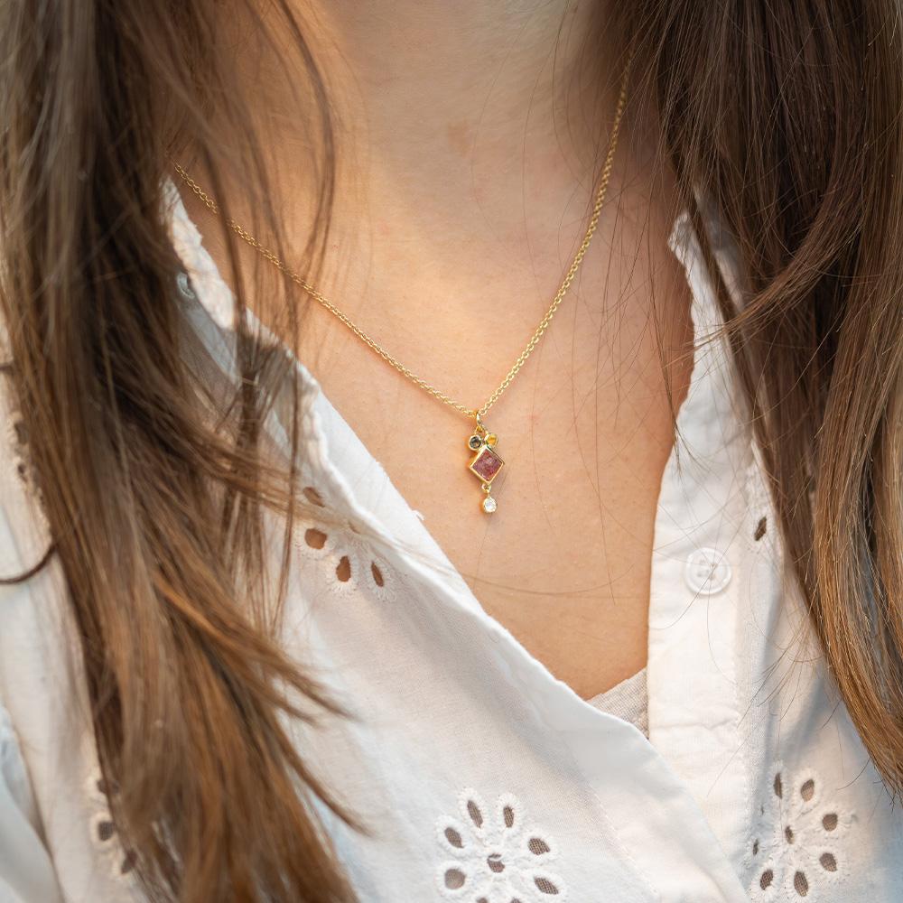 Deze vergulde ketting kan op 45 cm gedragen worden. De hanger is versierd met een 5 x 5 mm vierkante kersenkwarts, een 2,5 mm ronde rookkwarts, een 2 mm ronde citrien en een 2,5 mm ronde rozenkwarts.