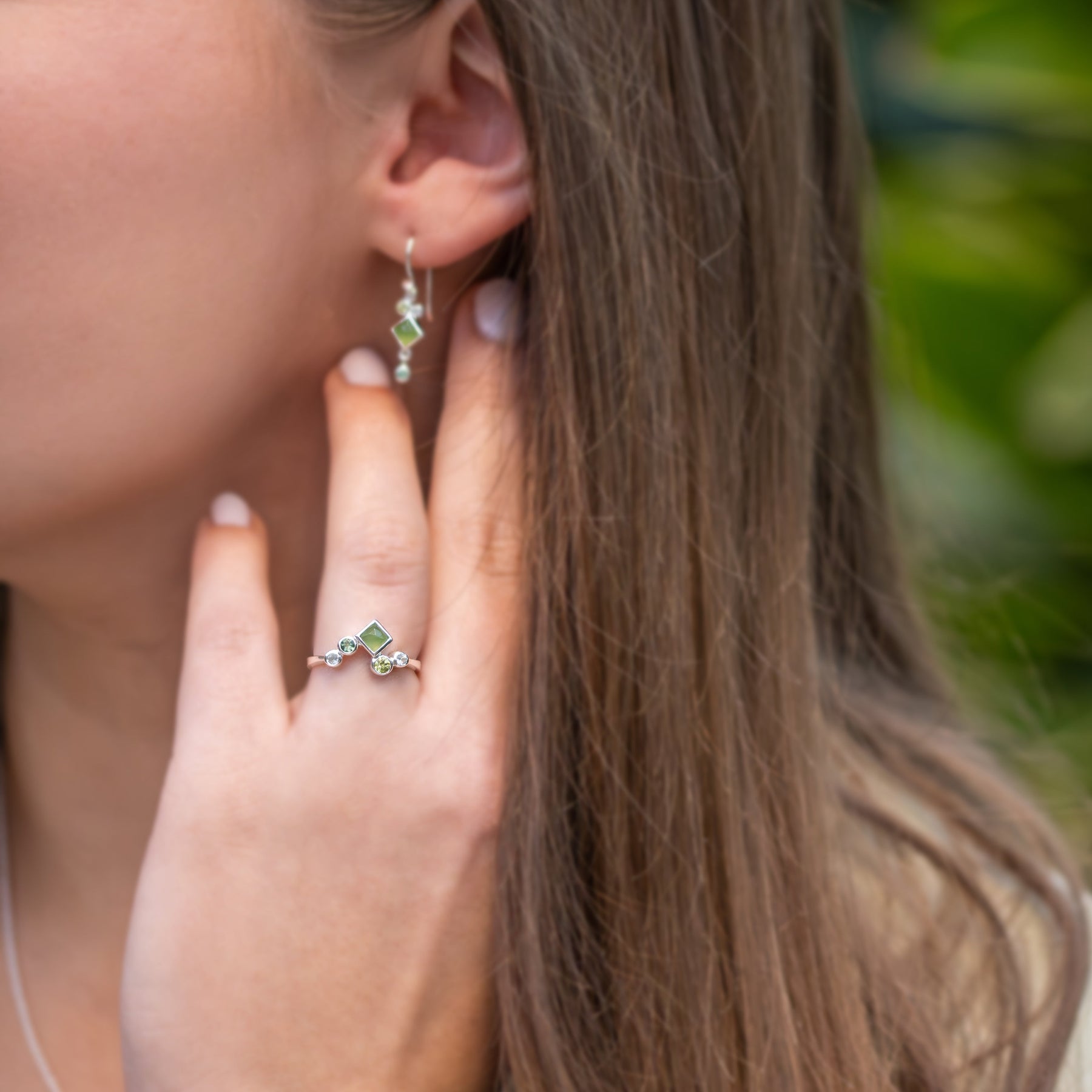 Deze sterling zilveren ring heeft een mooie 4 x 4 mm vierkante groene serpentijn, een ronde 3 mm peridoot, een ronde 2,5 mm groene kwarts en twee ronde 2 mm blauwe topaas.