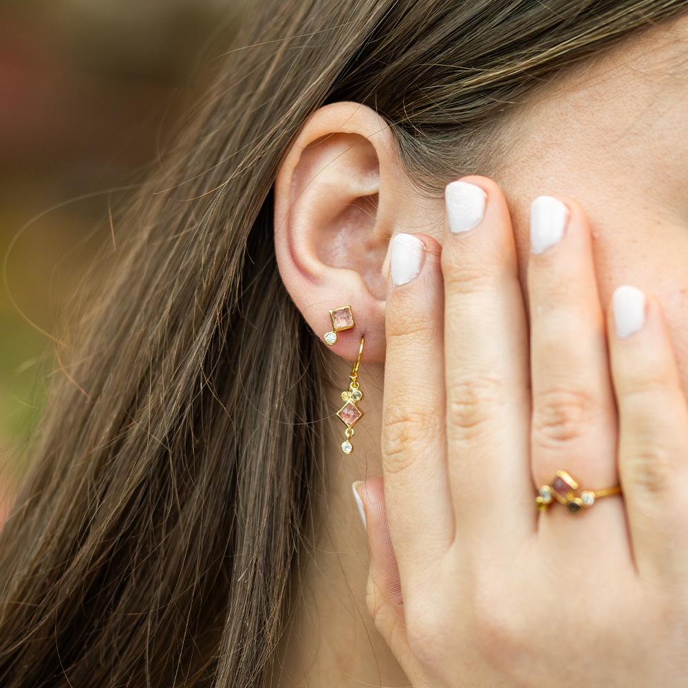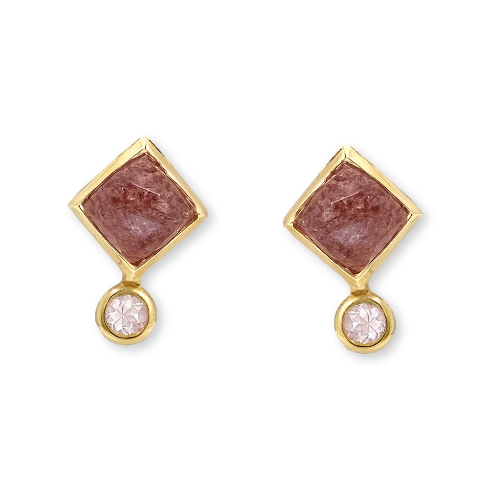 Deze vergulde oorknoppen bevatten elk een 4 x 4 mm vierkante kersenkwarts en een 2 mm ronde rozenkwarts.